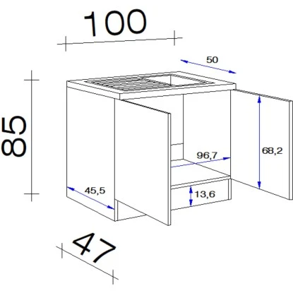 Die 100 cm breite Komplettspüle verfügt über eine Edelstahl-Auflagespüle inkl. Ab- und Überlaufgarnitur, in der schnell ein kleiner Abwasch erledigt werden kann. Der Unterschrank mit zwei Drehtüren garantiert Ihnen auch auf kleinen Flächen ein Höchstmaß an Stauraum.