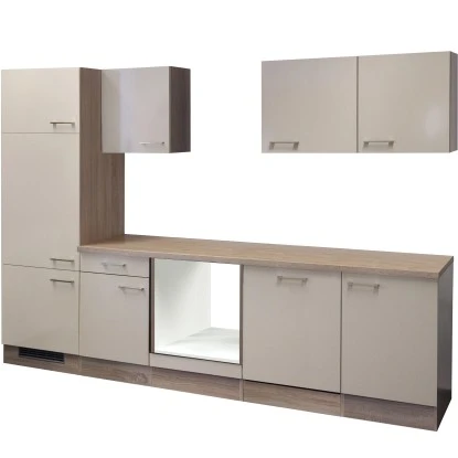 Sie sind auf der Suche nach einer neuen Küche? Sie mögen keine Möbel von der Stange und haben Spaß daran, die Dinge selber in die Hand zu nehmen? Die vorkonfigurierten Küchenzeilen überzeugen durch ihr Design und die vielfältigen Funktionen. Die Türen der Schränke sind sowohl für den links- als auch rechtsseitigen Aufbau vorbereitet, was Ihnen ein Höchstmaß an Flexibilität bei der Montage bietet. Die hochwertigen und pflegeleichten Kunststofffronten und die stabile Bauweise der Schrankkörper garantieren Ihnen lange Freude an Ihrer Küche. Eine Arbeitsplatte im passenden Design gehört bei dieser Küchenzeile mit dazu.