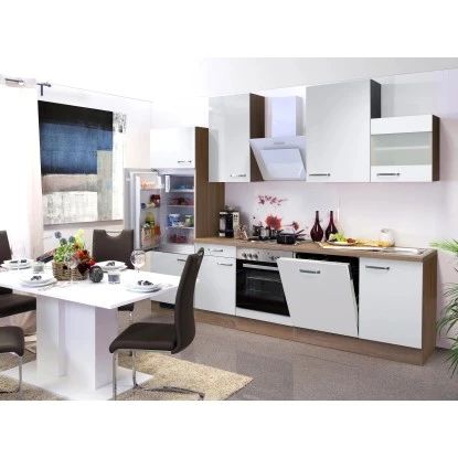 Die vorkonfigurierten Küchenzeilen überzeugen durch ihr Design und die vielfältigen Funktionen. Die Türen der Schränke sind sowohl für den links- als auch rechtsseitigen Aufbau vorbereitet, was Ihnen ein Höchstmaß an Flexibilität bei der Montage bietet. Die hochwertigen und pflegeleichten Kunststofffronten und die stabile Bauweise der Schrankkörper garantieren Ihnen lange Freude an Ihrer Küche. Eine Arbeitsplatte im passenden Design gehört bei dieser Küchenzeile mit dazu.