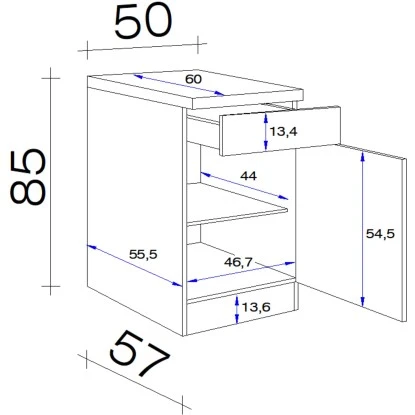 Der 50 cm breite Unterschrank weiß durch eine hochwertige Verarbeitung sowie Materialauswahl zu gefallen und garantiert Ihnen auch auf kleinen Flächen ein Höchstmaß an Stauraum. Dabei verfügt der kompakte Unterschrank neben einer Drehtür auch über einen Schubkasten und einen Einlegeboden.