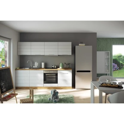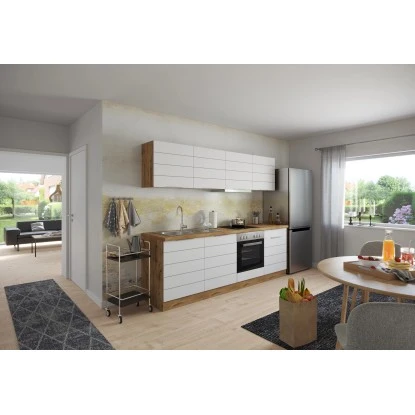 Die Küchenserie FLORENZ besticht durch ihre 2 absolut trendstarken Dekorkombinationen, in denen immer das ausdrucksstarke Wotan-Eichedekor eine entscheidende Rolle spielt. Elegante Metall-Griffleisten an hochwertigen MDF-Fronten mit Lisene in Mattweiß und Mattgrau werden mit einem ausdrucksstarken Eichedekor beim Korpus und der Arbeitsplatte kombiniert. So entsteht eine herausragende Optik, die genau den aktuellen Trend widerspiegelt. Eine Vielzahl an vordefinierten Zeilen und Winkel und verschiedenste Ergänzungsmöbel lassen keine Wünsche offen. In den Auszügen und hinter den Türen wird reichlich Stauraum für Küchenutensilien, Kochgeschirr und mehr geboten. Als Montagehilfe sind die einzelnen Schränke mit höhenverstellbaren Ausgleichsfüßen ausgestattet. Bestimmt werden Sie hier Ihre perfekte Küche finden!