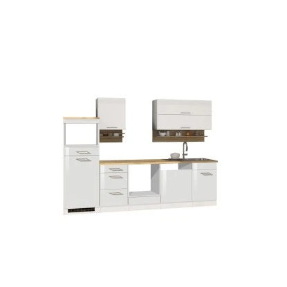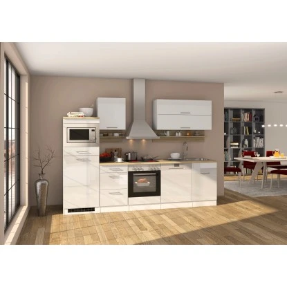 Die Serie Mailand zeichnet sich durch die hochglänzende MDF-Front, attraktiven Metallgriffen sowie der pflegeleichten Korpus-Kunststoffoberfläche aus. Die Schränke innen sind in Weiß gehalten. Zusätzlich findet sich hier eine Arbeitsplatte im Eiche Dekor ohne Ausschnitt für einen variablen Einsatz der Spüle.