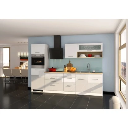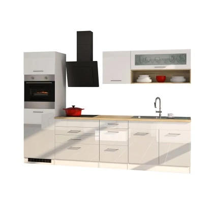 Die Serie Mailand zeichnet sich durch die hochglänzende MDF-Front, attraktiven Metallgriffen sowie der pflegeleichten Korpus-Kunststoffoberfläche aus. Die Schränke innen sind in Weiß gehalten. Zusätzlich findet sich hier eine Arbeitsplatte im Eiche Dekor ohne Ausschnitt für einen variablen Einsatz der Spüle.