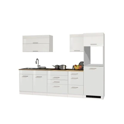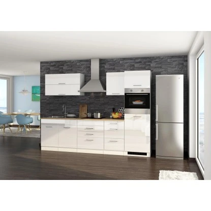 Die Serie Mailand zeichnet sich durch die hochglänzende MDF-Front, attraktiven Metallgriffen sowie der pflegeleichten Korpus-Kunststoffoberfläche aus. Die Schränke innen sind in Weiß gehalten. Zusätzlich findet sich hier eine Arbeitsplatte im Eiche Dekor ohne Ausschnitt für einen variablen Einsatz der Spüle.