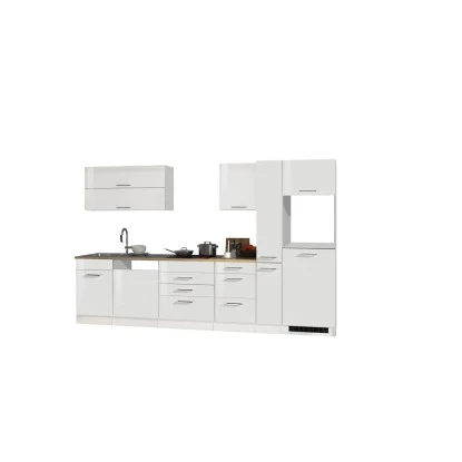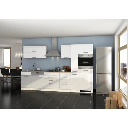Die Serie Mailand zeichnet sich durch die hochglänzende MDF-Front, attraktiven Metallgriffen sowie der pflegeleichten Korpus-Kunststoffoberfläche aus. Die Schränke innen sind in Weiß gehalten. Zusätzlich findet sich hier eine Arbeitsplatte im Eiche Dekor ohne Ausschnitt für einen variablen Einsatz der Spüle.