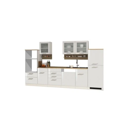 Die Serie Mailand zeichnet sich durch die hochglänzende MDF-Front, attraktiven Metallgriffen sowie der pflegeleichten Korpus-Kunststoffoberfläche aus. Die Schränke innen sind in Weiß gehalten. Zusätzlich findet sich hier eine Arbeitsplatte im Eiche Dekor ohne Ausschnitt für einen variablen Einsatz der Spüle.