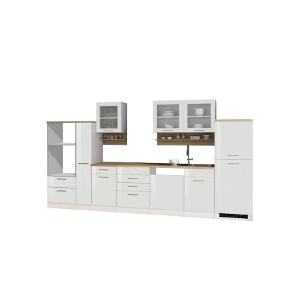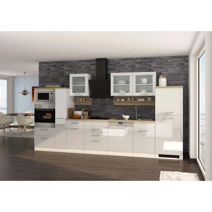 Die Serie Mailand zeichnet sich durch die hochglänzende MDF-Front, attraktiven Metallgriffen sowie der pflegeleichten Korpus-Kunststoffoberfläche aus. Die Schränke innen sind in Weiß gehalten. Zusätzlich findet sich hier eine Arbeitsplatte im Eiche Dekor ohne Ausschnitt für einen variablen Einsatz der Spüle.
