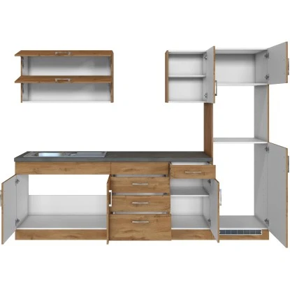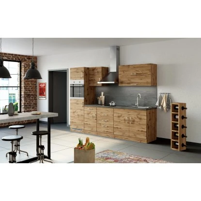 Die Küchenserie Sorrento besticht durch ihre 4 absolut trendstarken Dekorkombinationen, in denen immer das ausdrucksstarke Eichedekor eine entscheidende Rolle spielt. Durch eine Vielzahl an Zeilen- und Winkelkombinationen, die außerdem durch eine große Auswahl an Ergänzungsmöbeln komplettiert werden, ergibt sich ein breites Spektrum an Einrichtungsmöglichkeiten. Möchten Sie Ihren Backofen lieber autark in einem Hochschrank untergebracht haben? Benötigen Sie einen großzügigen Kühlschrank mit integriertem Gefrierschrank? Lagern Sie Ihre Vorräte gern in Auszügen und Apothekerschränken? Alle Schränke sind flexibel aufzustellen und die Türen sind wahlweise rechts oder links montierbar. Entscheiden Sie selbst- hier bleiben keine Wünsche offen.