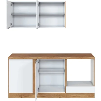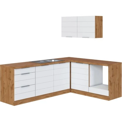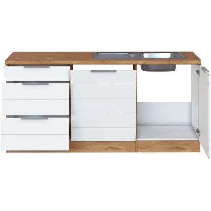 Die Küchenserie FLORENZ besticht durch ihre 2 absolut trendstarken Dekorkombinationen, in denen immer das ausdrucksstarke Wotan-Eichedekor eine entscheidende Rolle spielt. Elegante Metall-Griffleisten an hochwertigen MDF-Fronten mit Lisene in Mattweiß und Mattgrau werden mit einem ausdrucksstarken Eichedekor beim Korpus und der Arbeitsplatte kombiniert. So entsteht eine herausragende Optik, die genau den aktuellen Trend widerspiegelt. Eine Vielzahl an vordefinierten Zeilen und Winkel und verschiedenste Ergänzungsmöbel lassen keine Wünsche offen. In den Auszügen und hinter den Türen wird reichlich Stauraum für Küchenutensilien, Kochgeschirr und mehr geboten. Als Montagehilfe sind die einzelnen Schränke mit höhenverstellbaren Ausgleichsfüßen ausgestattet. Bestimmt werden Sie hier Ihre perfekte Küche finden!