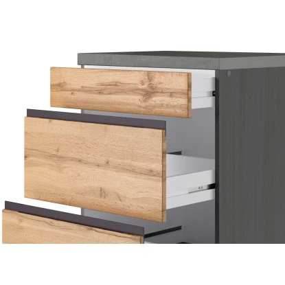 Die Winkelküche Turin von Held Möbel mit hochwertigen MDF-Fronten begeistert optisch durch die klaren Linien sowie die zweifarbige Gestaltung. Da die Schränke in zwei Farbkombinationen verfügbar sind, können Sie die Küche im Mix-and-Match Stil erweitern. Zusätzliche Akzente werden durch die 38 mm starke Arbeitsplatte im Beton Dekor gesetzt.