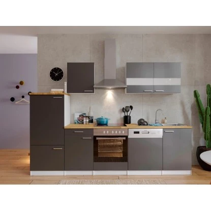 Eine funktionelle Küchenzeile mit bereits integrierten Elektroeinbaugeräten. Die Küchenzeile weiß mit einem zeitlosen Design und einer aktuellen Farbkombination zu gefallen. Dank der hochwertigen Ausstattung ist Ihnen ein hohes Maß an Komfort garantiert. Als besonderes Extra sind alle Scharniere mit der komfortablen Soft-Close Funktion ausgestattet. Die Küchenzeile verfügt über eine Gesamtbreite von 280 cm und lässt sich ganz nach Ihren Wünschen wechselseitig aufbauen. Alle Holzteile sind zerlegt und eignen sich dank einer detaillierten Aufbauanleitung zur einfachen Selbstmontage.