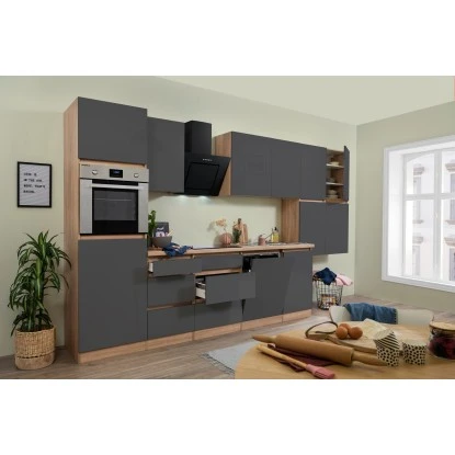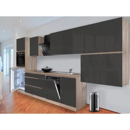 Respekta Küchenzeile GLRP380HESG Grifflos 380 Cm Grau Hochglanz-Sonoma Eiche