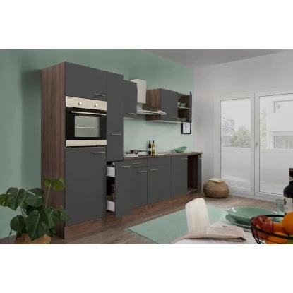 Die Respekta Küchenzeile ist mit einer Breite von 300 cm die ideale Küche für Familien, Paare und Wohngemeinschaften. Ihr Korpus in Eiche York Optik sowie die Seidenglanzfronten in den Farben Grau, Vanille und Weiß machen die Küche zu einem Blickfang. Drei Oberschränke, ein großer Apothekerschrank sowie Unterschränke und Schubladen bieten viel Stauraum für Ihre Küchenutensilien und Vorräte. Ein Glaskeramikkochfeld, ein Hochbaubackofen, eine Einbaukühlschrank, eine Kaminhaube und eine Einbauspüle komplettieren die Küche.