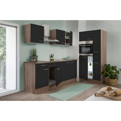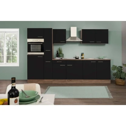 Die 300 cm breite Respekta Economy Küche ist die ideale Küche für Familien, Paare und Wohngemeinschaften. Ihr Eiche York Dekor sowie die Seidenglanzfronten in verschiedenen Farben machen die Küchenzeile zu einem Blickfang. Die Ober- und Unterschränke sowie Schubladen und ein Apothekerschrank bieten viel Stauraum für Ihre Küchenutensilien und Vorräte. Die Elektrogeräte komplettieren die Küchenzeile und machen sie zum geschmackvollen Einrichtungselement.