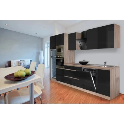 Respekta Premium Küchenzeile Grifflos 345 Cm Schwarz Hochglanz-Eiche Sägerau