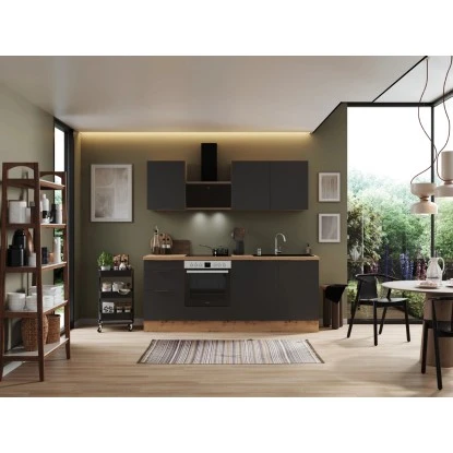 Die Respekta Selection Küchenzeile Elisabeth 220 cm bietet Ihnen alles, was Sie erwarten, um Ihren Traum von einer modernen und funktionalen Küche zu verwirklichen. Mit einer Arbeitshöhe von 91 cm und höhenverstellbaren Sockelfüssen ermöglicht sie Ihnen ein komfortables und ergonomisches Kochen. Dank der Schubkästen und Auszüge mit Vollauszug und Dämpfung, sowie der Glaseinlegeböden bei den Hängeschränken können Sie den Stauraum optimal ausnutzen. Profitieren Sie von der Lieferung fertig montierter Küchenschränke und erhalten Sie eine leistungsstarke und moderne Küchenlösung, die Sie über viele Jahre hinweg begleiten wird.