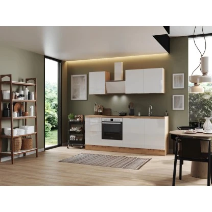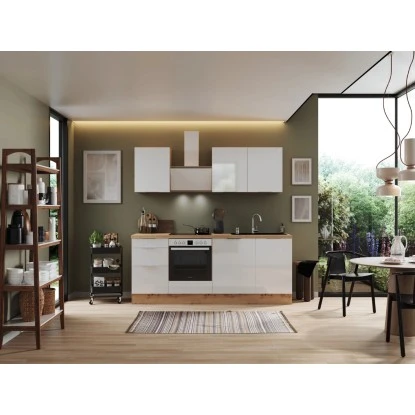 Die Respekta Selection Küchenzeile Elisabeth 220 cm bietet Ihnen alles, was Sie erwarten, um Ihren Traum von einer modernen und funktionalen Küche zu verwirklichen. Mit einer Arbeitshöhe von 91 cm und höhenverstellbaren Sockelfüssen ermöglicht sie Ihnen ein komfortables und ergonomisches Kochen. Dank der Schubkästen und Auszüge mit Vollauszug und Dämpfung, sowie der Glaseinlegeböden bei den Hängeschränken können Sie den Stauraum optimal ausnutzen. Profitieren Sie von der Lieferung fertig montierter Küchenschränke und erhalten Sie eine leistungsstarke und moderne Küchenlösung, die Sie über viele Jahre hinweg begleiten wird.