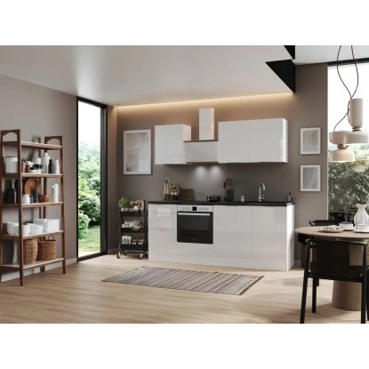 Die Respekta Selection Küchenzeile Elisabeth 220 cm bietet Ihnen alles, was Sie erwarten, um Ihren Traum von einer modernen und funktionalen Küche zu verwirklichen. Mit einer Arbeitshöhe von 91 cm und höhenverstellbaren Sockelfüssen ermöglicht sie Ihnen ein komfortables und ergonomisches Kochen. Dank der Schubkästen und Auszüge mit Vollauszug und Dämpfung, sowie der Glaseinlegeböden bei den Hängeschränken können Sie den Stauraum optimal ausnutzen. Profitieren Sie von der Lieferung fertig montierter Küchenschränke und erhalten Sie eine leistungsstarke und moderne Küchenlösung, die Sie über viele Jahre hinweg begleiten wird.