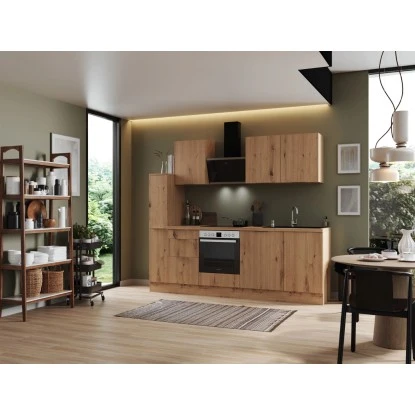 Die Respekta Selection Küchenzeile Elisabeth 250 cm bietet Ihnen alles, was Sie erwarten, um Ihren Traum von einer modernen und funktionalen Küche zu verwirklichen. Mit einer Arbeitshöhe von 91 cm und höhenverstellbaren Sockelfüssen ermöglicht sie Ihnen ein komfortables und ergonomisches Kochen. Dank der Schubkästen und Auszüge mit Vollauszug und Dämpfung, sowie der Glaseinlegeböden bei den Hängeschränken können Sie den Stauraum optimal ausnutzen. Profitieren Sie von der Lieferung fertig montierter Küchenschränke und erhalten Sie eine leistungsstarke und moderne Küchenlösung, die Sie über viele Jahre hinweg begleiten wird.