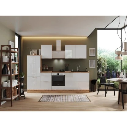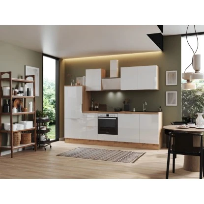 Die Respekta Selection Küchenzeile Elisabeth 280 cm bietet Ihnen alles, was Sie erwarten, um Ihren Traum von einer modernen und funktionalen Küche zu verwirklichen. Mit einer Arbeitshöhe von 91 cm und höhenverstellbaren Sockelfüssen ermöglicht sie Ihnen ein komfortables und ergonomisches Kochen. Dank der Schubkästen und Auszüge mit Vollauszug und Dämpfung, sowie der Glaseinlegeböden bei den Hängeschränken können Sie den Stauraum optimal ausnutzen. Profitieren Sie von der Lieferung fertig montierter Küchenschränke und erhalten Sie eine leistungsstarke und moderne Küchenlösung, die Sie über viele Jahre hinweg begleiten wird.