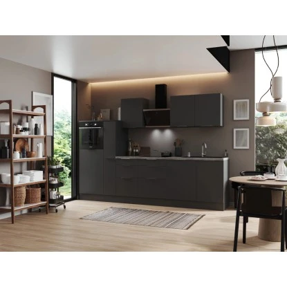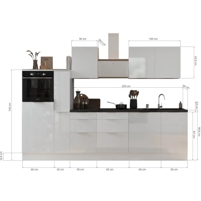 Die Respekta Selection Küchenzeile Elisabeth 310 cm bietet Ihnen alles, was Sie erwarten, um Ihren Traum von einer modernen und funktionalen Küche zu verwirklichen. Mit einer Arbeitshöhe von 91 cm und höhenverstellbaren Sockelfüssen ermöglicht sie Ihnen ein komfortables und ergonomisches Kochen. Dank der Schubkästen und Auszüge mit Vollauszug und Dämpfung, sowie der Glaseinlegeböden bei den Hängeschränken können Sie den Stauraum optimal ausnutzen. Profitieren Sie von der Lieferung fertig montierter Küchenschränke und erhalten Sie eine leistungsstarke und moderne Küchenlösung, die Sie über viele Jahre hinweg begleiten wird.