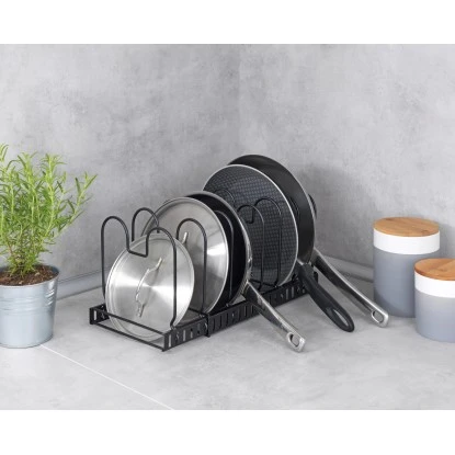 Interior Design auf höchstem Niveau: Der trendige Deckel- und Pfannenhalter Schwarz im Industrial Style verleiht Ihren Räumen das gewisse Etwas. Mit seinem geradlinigen Design und der starken Präsenz schafft das Küchenregal im angesagten Schwarz den idealen Kontrast zu hellen Küchen.