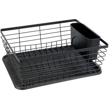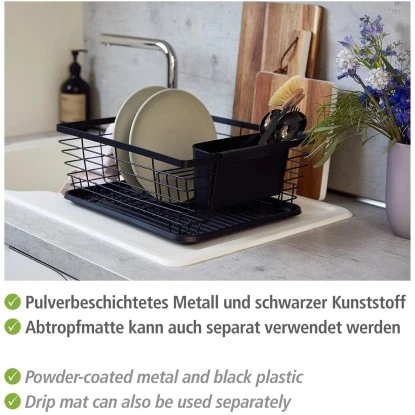 Material: Der geräumige Geschirrabtropfer besteht aus einem Gestell aus pulverbeschichtetem Metall und schwarzen Kunststoffteilen, wodurch er besonders langlebig und robust ist.
