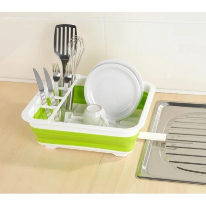 Das handliche Abtropfgestell ist im modernen Grün-Weiß gehalten und lässt sich bei Nichtgebrauch platzsparend zusammenfalten.